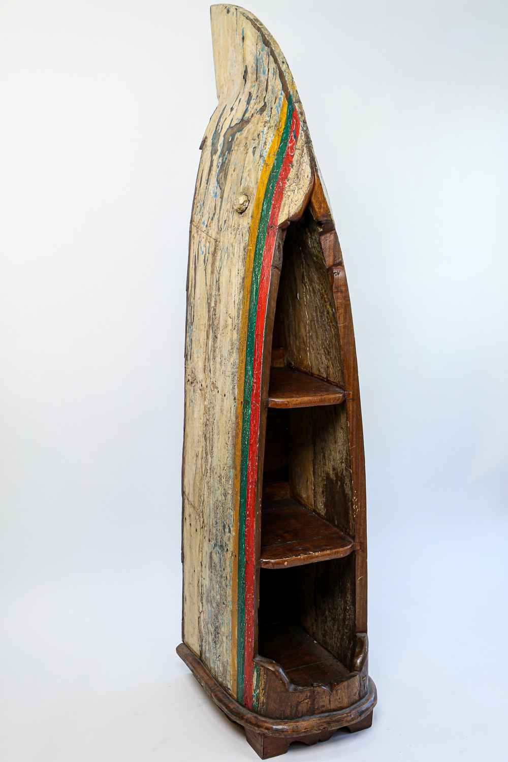 Ancienne Pirogue vétuste choisie pour sa belle patine d’origine et revisitée pour servir de bibliothèque.